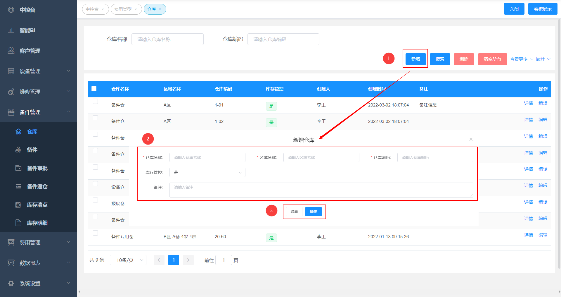 新增仓库点击“新增按钮”输入信息,确定保存。