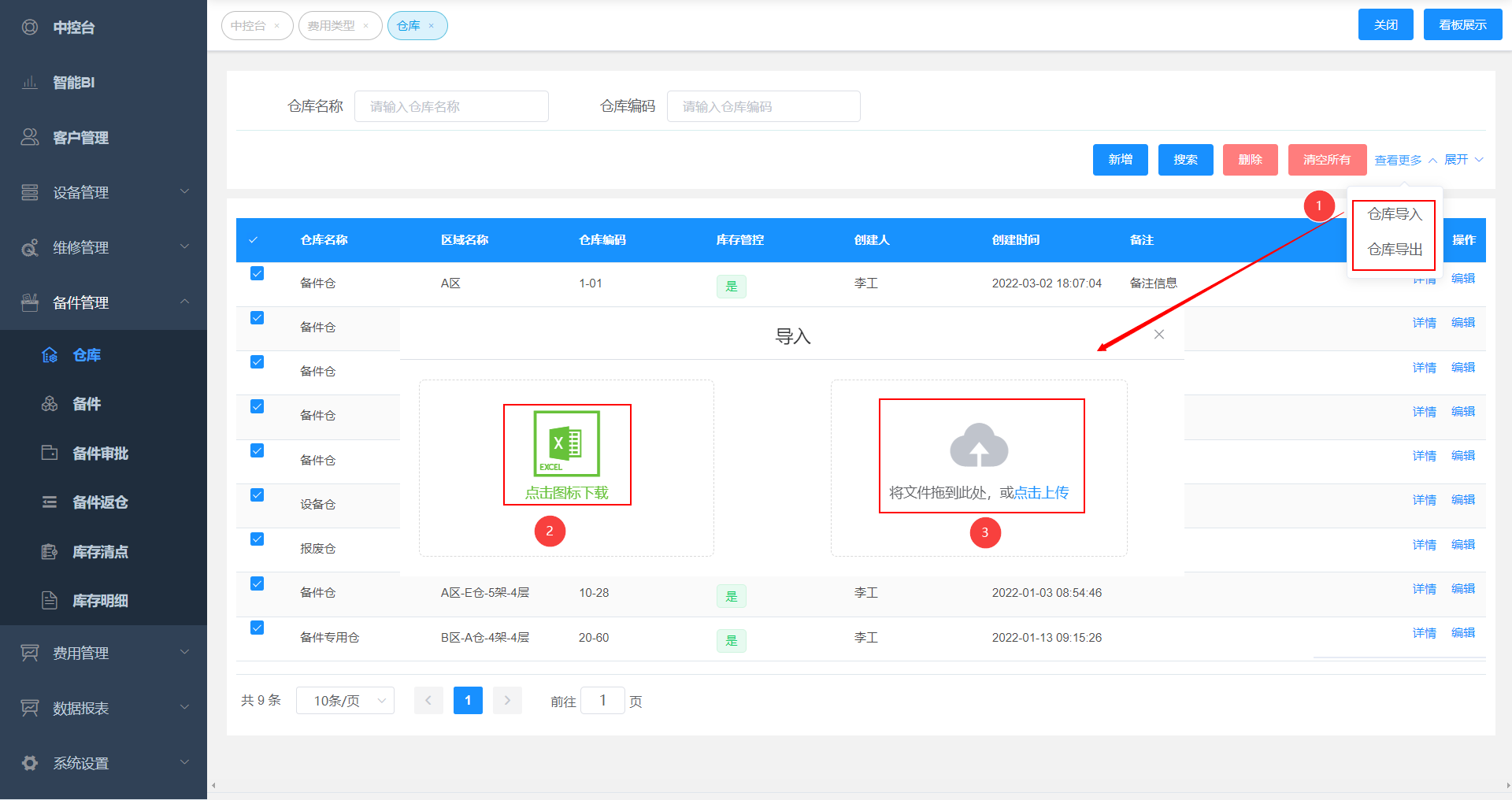 支持设备文档一次性导入设备分类、设备型号、设备台账资料。