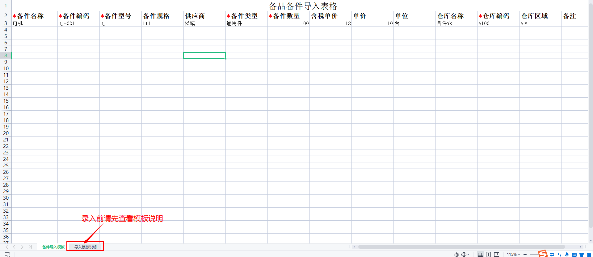 备件填写信息请先查阅“导入模板说明”表格中带*为必填项
