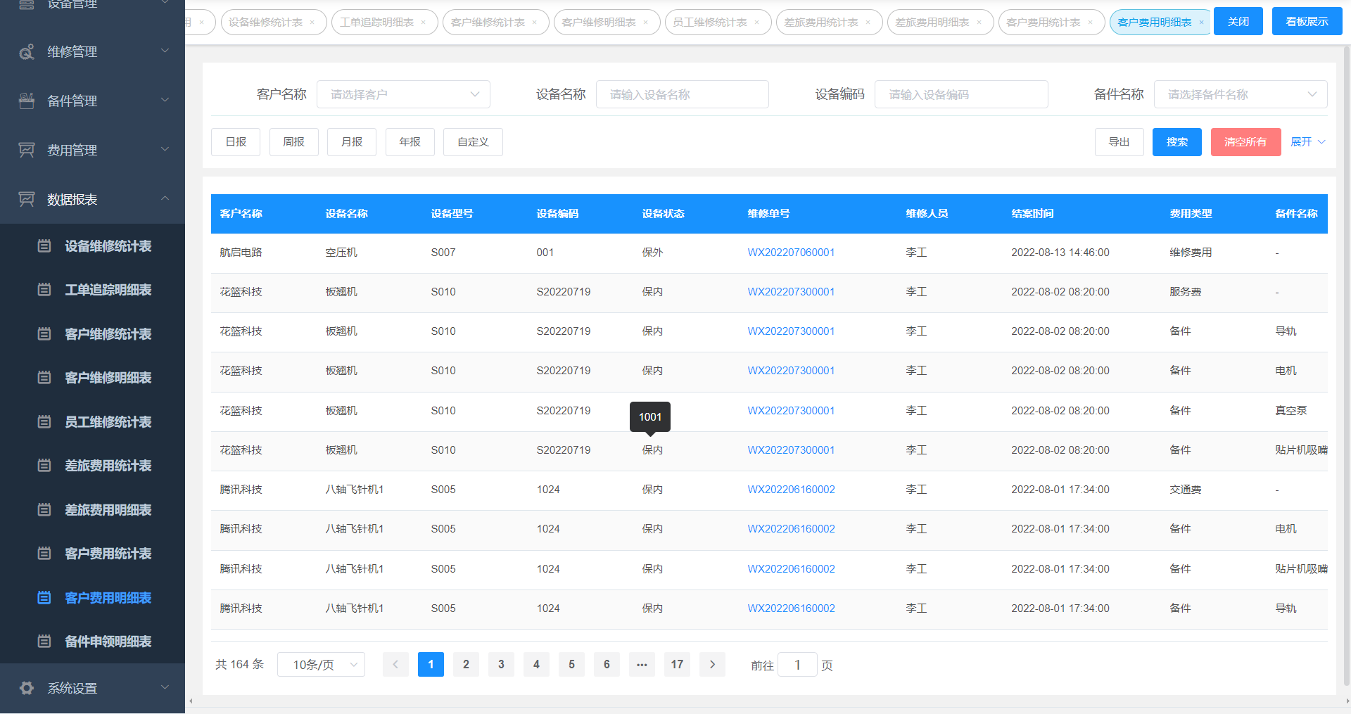 客户费用统计表,统计客户报修产生的费用(配件费,工时费)